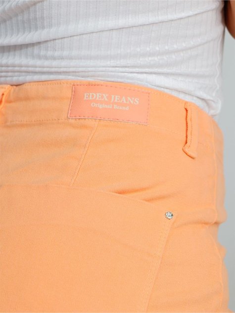 A cintura é intermediária ficando na altura do umbigo com pala arredondada, etiqueta com a marca Edex Jeans na parte posterior. Peça na cor laranja, possui nervuras na parte frontal e posterior afinando a silhueta, botơes e aviamentos na cor prata, dando alta performance ao produto.