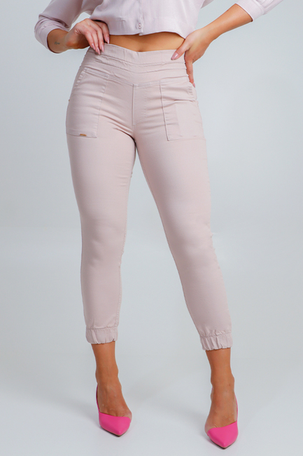 Detalhes: Possui 2 bolsos na parte frontal alongados e 2 bolsos na parte posterior. Cós com elástico e aviamentos na cor dourada.