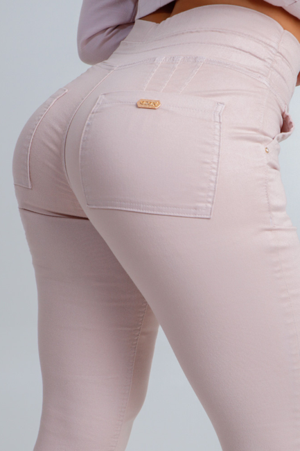 Calça com pala arredondada e tecido tecnológico com alto poder de valorizaçăo das curvas da mulher que usa Edex Jeans. Tecnologia responsável por modelar e valorizar o bumbum feminino.
