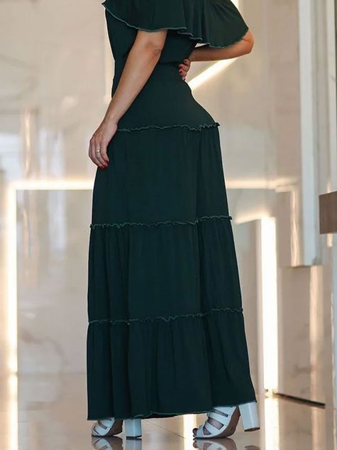 Peças nas cor verde, modelagem longa evasê com recortes efeito franzido, e cintura marcada com detalhe em elástico, acabamento barra a fio, dando um toque de sofisticaçăo.