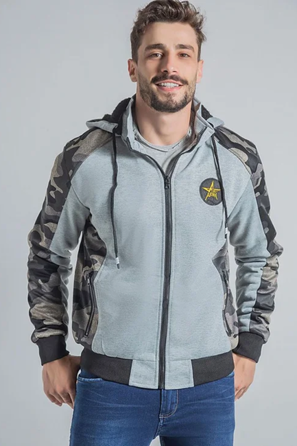 A Jaqueta de Moletom Masculina Camuflado apresenta um design moderno que une base em moletom cinza mescla com recortes em estampa camuflada nas mangas e laterais. O modelo possui capuz ajustável com cordões e fechamento frontal em zíper. A proposta visual traz um estilo urbano marcante, ideal para quem procura jaqueta masculina de moletom com capuz e visual diferenciado. Uma peça que chama atenção pelo contraste de cores e pela identidade contemporânea.