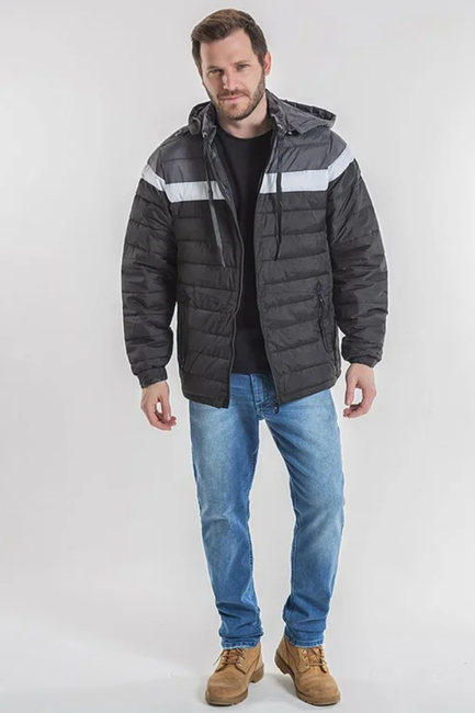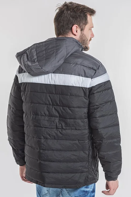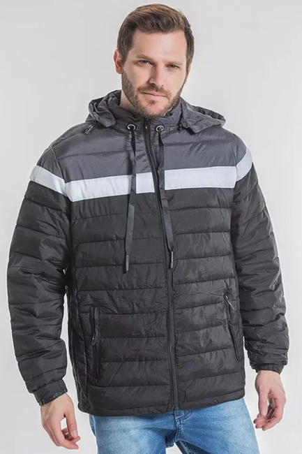 Modelo jaqueta nylon com cores contrastantes, com manga longa, com fechamento em zíper, possui 2 bolsos frontais, conta com elástico no punho, barra e no capuz, e detalhes de costura na peça inteira, dando um toque de sofisticaçăo.