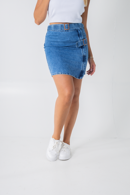 Esta saia jeans curta se destaca por seu design inovador, que combina duas fivelas, uma que acompanha a peça como cinto e outra fixada diretamente na saia. Essa característica não apenas enriquece a estética da saia, mas também proporciona um ajuste personalizado e um visual dinâmico. A fivela do cinto permite que você ajuste a saia conforme necessário, enquanto a fivela fixa adiciona um detalhe fashion.