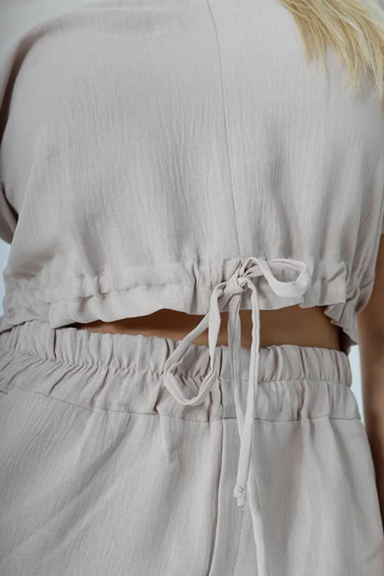 A modelagem da blusa Cropped com ajuste na cintura realça a silhueta e tem o detalhe de amarração ajustável, permitindo customização do caimento. Disponível nas cores Areia e Violeta, ideais para compor looks modernos e delicados e nos tamanhos PP e P..