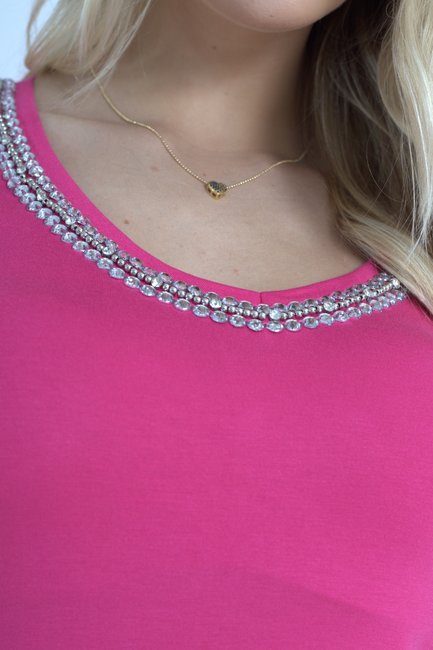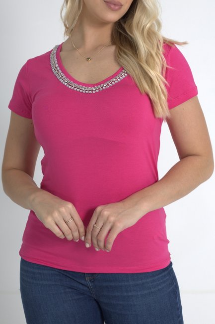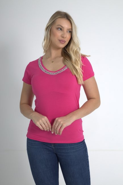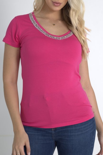 A beleza da Camiseta T-Shirt Feminina Gola V Bordada está nos detalhes, especialmente nas pedrarias que decoram sua gola V. Essas pedrarias adicionam um toque de elegância e sofisticação à peça, fazendo com que ela se torne mais que uma simples camiseta. O brilho suave das pedrarias ilumina o look, criando um visual moderno e chique.