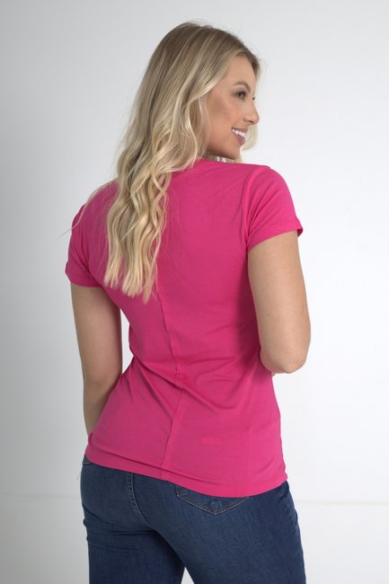 Esta camiseta é confeccionada em um tecido de viscose e elastano que combina o melhor de dois mundos: a suavidade e o caimento fluido da viscose com a flexibilidade e resistência do elastano. Esse mix de materiais garante que a camiseta se ajuste confortavelmente ao corpo. A gola em V traz um toque delicado e moderno à peça, destacando a região do pescoço e oferecendo um visual mais alongado e sofisticado.